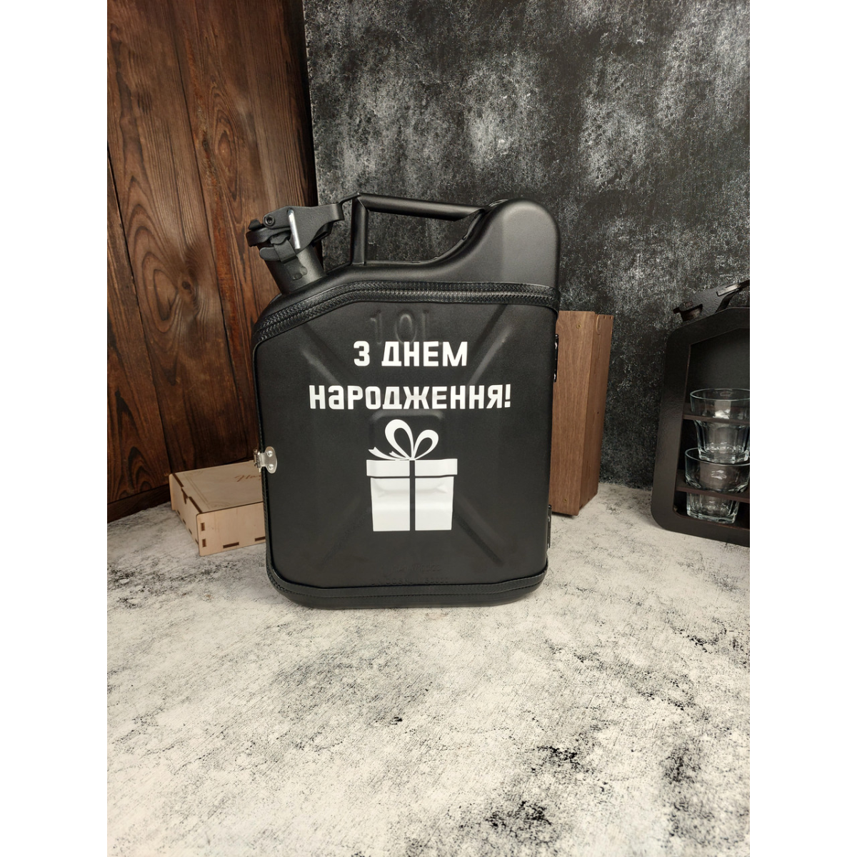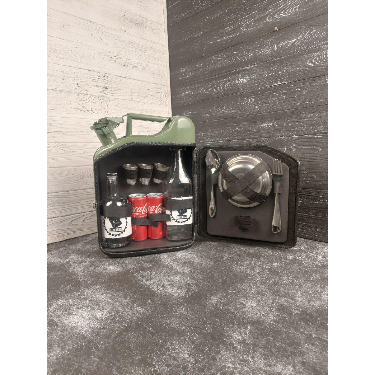 Каністра міні бар для алкоголю на 10 літрів з посудом “Пікнік“ чорна в подарунок чоловікові