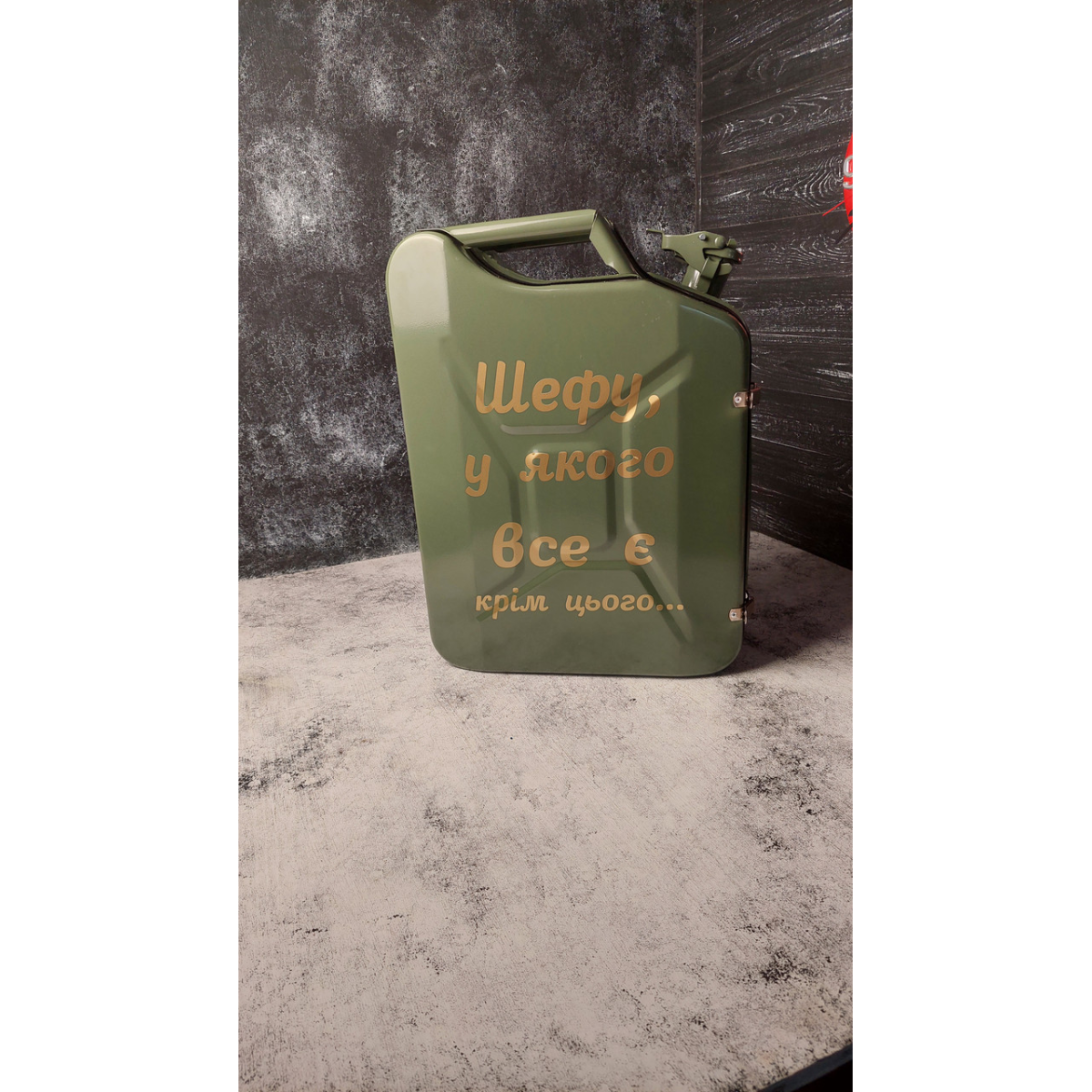 Цей стильний та функціональний міні-бар виготовлений зі справжньої металевої каністри об'ємом 20 літрів. Він розроблений для розміщення двох пляшок (1 л та 0,7 л), чотирьох банок об'ємом 0,33 л та чотирьох склянок об'ємом 250 мл. На лівій стороні розміщуються посуд для чотирьох осіб, фляга, а також цигарки, запальничка або солодощі.