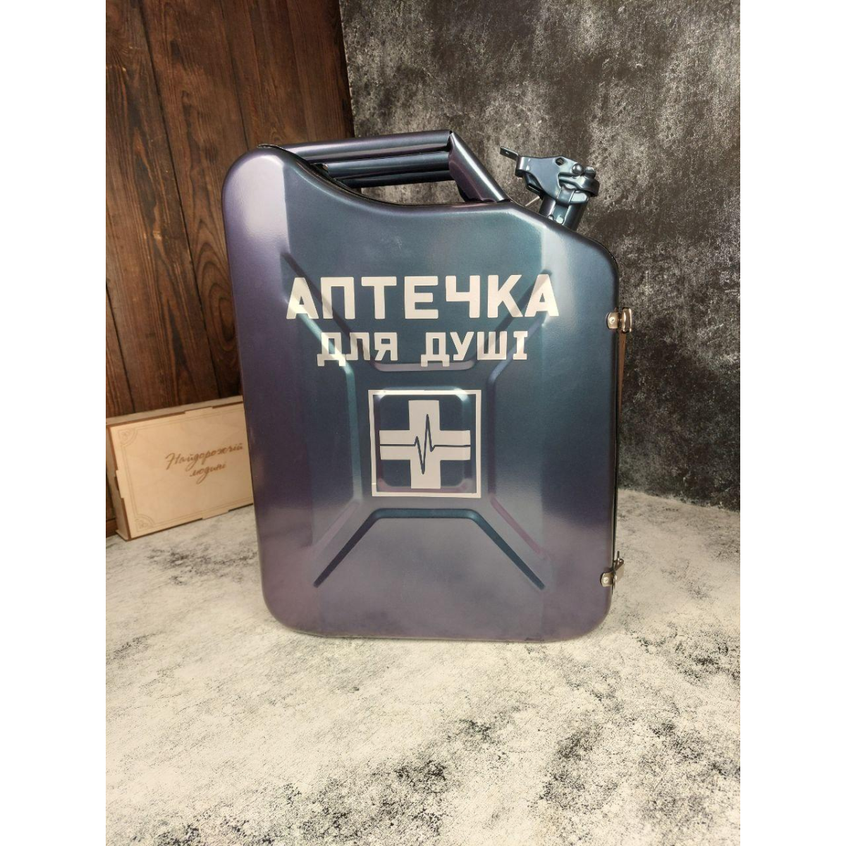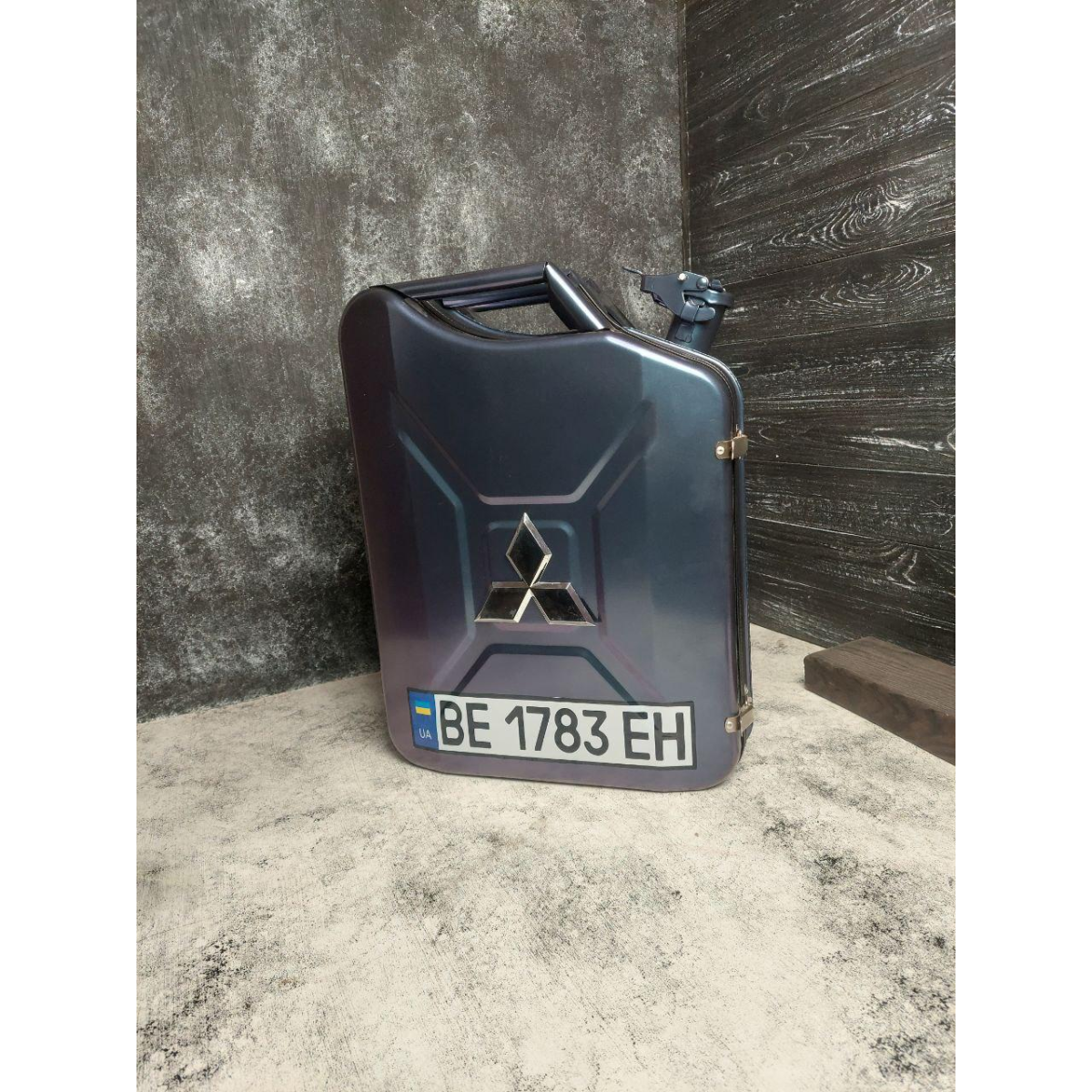 Цей стильний та функціональний міні-бар виготовлений зі справжньої металевої каністри об'ємом 20 літрів. Він розроблений для розміщення двох пляшок (1 л та 0,7 л), чотирьох банок об'ємом 0,33 л та чотирьох склянок об'ємом 250 мл. На лівій стороні розміщуються посуд для чотирьох осіб, фляга, а також цигарки, запальничка або солодощі.