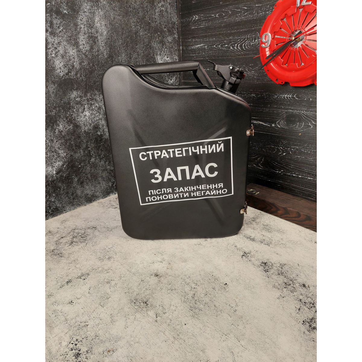 Цей стильний та функціональний міні-бар виготовлений зі справжньої металевої каністри об'ємом 20 літрів. Він розроблений для розміщення двох пляшок (1 л та 0,7 л), чотирьох банок об'ємом 0,33 л та чотирьох склянок об'ємом 250 мл. На лівій стороні розміщуються посуд для чотирьох осіб, фляга, а також цигарки, запальничка або солодощі.